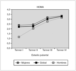 Metodología: Un total de 350 niños y adolescentes de ambos sexos y estadios puberales, sanos de la comunidad autónoma de Madrid participaron en el estudio tras consentimiento informado de los padres y del comité ético. Se determinaron los valores en ayunas de insulinemia y péptido C mediante quimioluminiscencia (ELECSYS; Roche), y se calculó el índice HOMA, así como el IMC: peso/talla 2. Para análisis estadístico se empleó el SPSS versión 11.0. Las variables se expresaron como media +DE. El análisis de la varianza mediante Kolmorogov, Shapiro.Wilk, t de Student, U de Mann. Whitney, Bonferroni, Kruskall-Wallis y test de Levene. Nivel de significación p < 0,05.