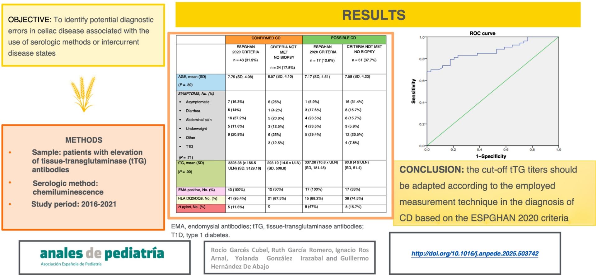 Celiac disease (CD) is a systemic immune-mediated disease induced by the consumption of gluten and related prolamins in genetically predisposed individuals.1 Its incidence has increased in recent years2 and it has a variable clinical presentation. The diagnosis of CD in children has been simplified over time, thanks to improvements in serological diagnosis methods and the new diagnostic criteria proposed by the European Society for Paediatric Gastroenterology, Hepatology and Nutrition (ESPGHAN). The most recent ESPGHAN guidelines (ESPGHAN 2020) allow the no-biopsy diagnosis approach in children with serum levels of IgA antibodies against tissue transglutaminase (tTG) 10 times the upper limit of normal (ULN) or greater obtained with a validated test in addition to positive endomysial antibodies (EMA-IgA) in a second serum sample.3 This approach allows rapid diagnosis with a high reliability.1 There is also evidence suggesting that higher tTG titers can predict the degree of villous atrophy in CD.4 On the other hand, the techniques used to measure antibody levels may differ between laboratories and vary in terms of the sensitivity or specificity they offer. The most standardized technique currently available is the enzyme-linked immunosorbent assay (ELISA), but chemiluminescent immunoassay has exhibited substantial diagnostic sensitivity. However, the presence of certain pathogens, such as Giardia,5 may interfere with antibody measurement with the chemiluminescence approach, as can certain autoimmune or inflammatory diseases whose presence may cause a transient elevation of antibody titers unrelated to gluten exposure. A recent study found an association between transient elevation of tTG and the presence of Helicobacter pylori in the gastrointestinal tract.6