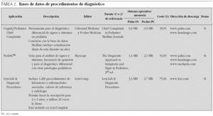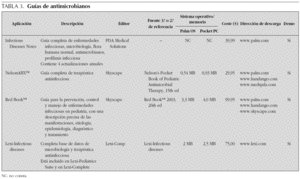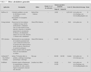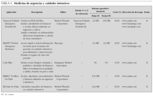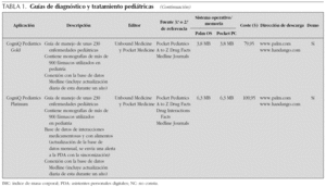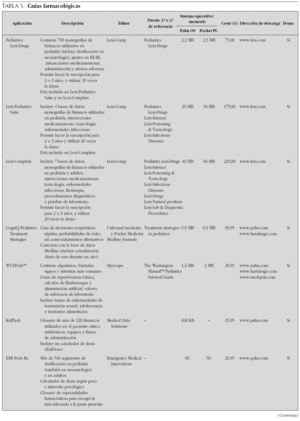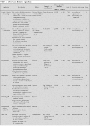 Como se podrá comprobar, en internet se pueden encontrar múltiples aplicaciones muy útiles. Se han recopilado un total de 46 aplicaciones útiles incluidas en las tablas 1 a 7 del tipo: guías de diagnóstico y de tratamiento pediátricas; bases de datos de procedimientos diagnósticos; guías de terapéutica antimicrobiana en pediatría y en el adulto; guías de diagnóstico y tratamiento en medicina de urgencia y cuidados intensivos; catálogos de medicamentos generales con fichas farmacológicas completas (indicaciones, dosis, efectos adversos, interacciones, toxicología, embarazo, lactancia, y otros); bases de datos específicas de neonatología, otorrinolaringología y cirugía pediátrica, y software calculador médico 7-13. Para cada referencia se muestran: descripción, fuente terciaria o secundaria de referencia, necesidades de memoria y sistema operativo, coste, dirección de descarga y versión de prueba. En la tabla 8 se incluyen algunos portales con su dirección para descargar software para PDA.
