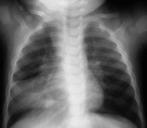 A los niños con Mantoux positivo se les realizó una radiografía de tórax que fue patológica en 10 de los 11 (90,9 %) que fueron derivados a nuestro hospital. El niño sin alteraciones radiológicas recibió profilaxis con isoniazida durante 9 meses. La edad media fue de 23,1 meses (11-42 meses). De estos 10 niños, siete estaban sintomáticos en el momento del estudio, cinco presentaban tos, cinco fiebre y uno eritema nudoso (tabla 1). Las imágenes radiológicas mostraron condensación parenquimatosa en el 90 % de los pacientes y adenopatía parahiliar en el 50 % (figs. 1-3).