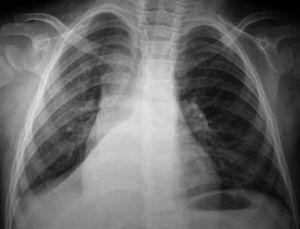 Figura 3. Paciente n.º 1 (inicial). Condensación del lóbulo medio derecho.