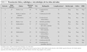 En nuestro caso, la sensibilidad de DMD y la del cultivo fueron iguales (70 %), aunque hubo 2 niños con cultivo positivo y DMD negativa y 2 niños con DMD positiva y cultivo negativo. Únicamente un niño no presentó ninguno de los exámenes microbiológicos positivos, aunque la sospecha clínica y radiológica era firme junto con un Mantoux 13 mm, reforzando el diagnóstico la buena evolución que presentó tras iniciar la terapia.
