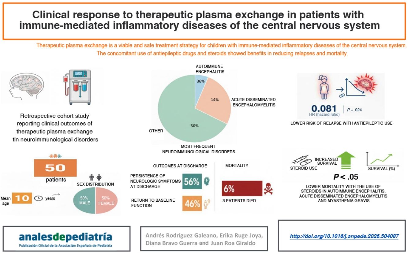 Inflammatory immune-mediated diseases of the central nervous system (CNS) comprise a heterogeneous group of neurologic disorders where the immune system plays a central role in the pathophysiology of the disease.1 In the pediatric population, these diseases include Guillain-Barré syndrome, myasthenia gravis, Anti-N-methyl-d-aspartate (NMDA) receptor encephalitis, and acquired demyelinating neuropathies, among others.2,3 Although these conditions are relatively rare in children, the development of more sensitive and specific diagnostic tools has enabled earlier and more accurate identification.2,4 The treatment of these diseases has advanced considerably, with the introduction of several immunomodulatory strategies.3,5 Among these, therapeutic plasma exchange (TPE) has emerged as an effective option, especially in cases refractory to conventional treatment with steroids or other immunosuppressive therapies.2,3 Several international clinical guidelines support the use of TPE with varying strengths of recommendation, and its implementation in clinical practice has grown significantly in recent years.2,3,5,6 In this context, we conducted a study with the following objectives: (a) to describe the demographic and clinical characteristics of patients with immune-mediated inflammatory diseases of the CNS treated with TPE; (b) to describe TPE protocols in terms of the type and number of sessions, replacement modality, associated complications, and tolerance; (c) to determine the incidence of relapse and mortality in this population; and (d) to assess the potential association of adjuvant therapies (including steroids, antiepileptic drugs, immunomodulators, biologics, and psychotropic drugs) with relapse and mortality.