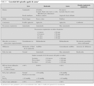 En la tabla 1 se establece un sistema de evaluación de la gravedad del episodio agudo de asma modificado de la GINA 6.