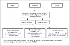 Agonistas β2-adrenérgicos de corta duración. Constituyen la primera línea de tratamiento. Sus beneficios en el tratamiento de la crisis han sido suficientemente contrastados 24-33 (evidencia B). La vía inhalatoria es la de elección por presentar una mayor efectividad con menos efectos secundarios.