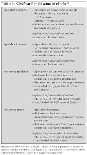 La clasificación del asma en el niño mayor de 3 años se realiza de la misma forma que en el niño menor de 3 años, tal y como de indica en la tabla 5.