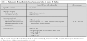 Esta sección se divide en dos apartados de acuerdo a la edad del paciente que hay que tratar: niños de hasta 3 años y niños de más de 3 años. La mayoría de las guías se centran en el adulto aunque tengan algún apartado dedicado al niño. Ninguna especifica un tratamiento para el lactante de acuerdo con su clasificación fenotípica.