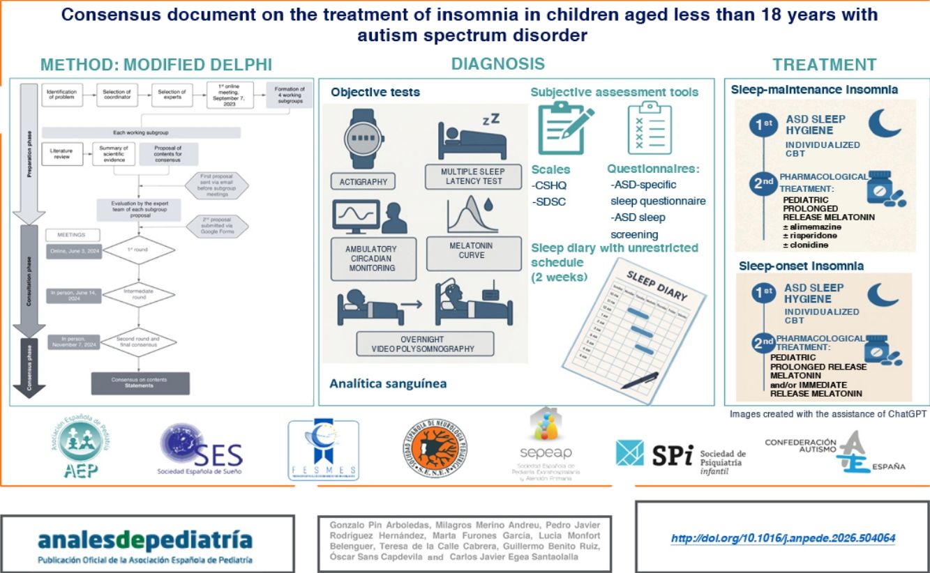 For this reason, the Sleep and Chronobiology Committee of the Asociación Española de Pediatría (AEP, Spanish Association of Pediatrics) and the Pediatrics Group of the Sociedad Española de Sueño (SES, Spanish Sleep Society) decided to organize an interdisciplinary group to develop a consensus document on the assessment and treatment of insomnia in the pediatric population with ASD.