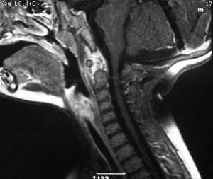 Ingresó con el mismo tratamiento y collarín cervical por mantener la sospecha de origen muscular de su tortícolis. Se realizaron varias pruebas complementarias como TC craneal, gammagrafía ósea y ecografía cervical con el objetivo de detectar, entre otros procesos, tumores intracraneales, osteomielitis y masas cervicales, que terminaron por descartarse. Posteriormente se realizó una RM craneal y cervical, presentando un proceso inflamatorio a nivel atlantoaxoideo y periodontoideo compatible con espondilitis atloaxoidea (fig. 1). Ante un posible origen infeccioso, se inició el tratamiento antibiótico con cefotaxima y cloxacilina con mejoría clínica progresiva. Se incluyó perfil reumatológico, que fue negativo.