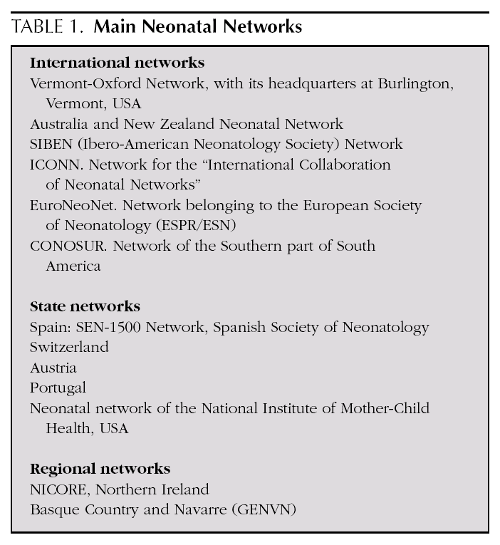 The systematic prospective gathering of homogeneous indicators enables inter-centre comparisons to be made, for use in epidemiological control and evaluation of the quality of care delivered to these patients at such high risk. Various experiences of networking exist, which have tackled and resolved the problem of specific information on ELBWI (table 1). The best known of these is the Vermont-Oxford Neonatal Network (VON) in the United States 8. Among us, most Spanish NICUs take part in the SEN-1500 initiative coordinated by the Spanish Neonatology Society (www.se-neonatal.es) and some take part in the EuroNeoNet (www.euroneonet.org).