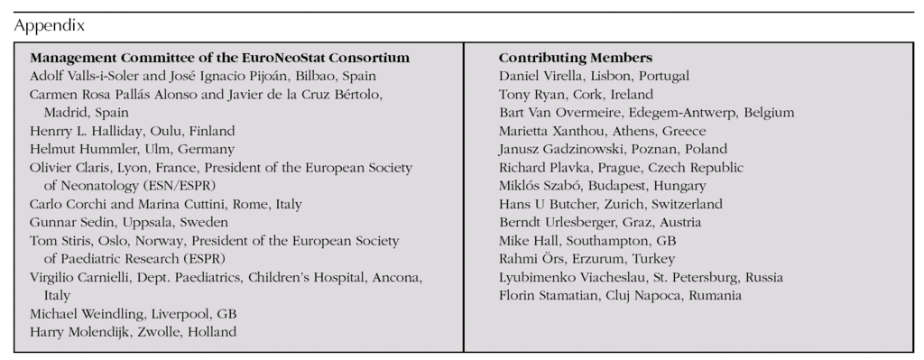 The management committee of EuroNeoNet, with the experience accumulated since 2002, decided to put forward a proposal for developing an epidemiological project to the 2005 Public Health Call of the EC (proposal number A/790698, contract 2005/16), under the title "European Information System for monitoring short- and long-term morbidity in order to improve quality of care and patient safety for extremely low birth-weight infants". The initiative was approved for the period 2006-8 and is known by the acronym, EuroNeoStat.