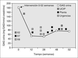 En el caso 1, tras 40 semanas de intervención, se observó una mejoría clínica de la insuficiencia respiratoria crónica, que se tradujo en una menor aspiración de secreciones traqueales con requerimientos de oxigenoterapia nocturna ocasional. También mejoró la expresión facial (sonrisa social), la manipulación manual (desaparición del síndrome del túnel carpiano) y la movilidad articular de extremidades inferiores posibilitando la bipedestación ocasional con apoyo. La organomegalia desapareció a los 4 meses de la intervención. La displasia ósea y el retraso neurológico grave persistieron a pesar del tratamiento enzimático sustitutivo. No se produjeron modificaciones significativas de la miocardiopatía (crecimiento del ventrículo izquierdo no obstructivo), las opacidades corneales bilaterales, la sordera de conducción ni la dismorfia facial. La mejoría clínica producida durante las primeras 40 semanas de la intervención coincidió con una disminución marcada de los GAG en orina (comprendida entre el 59,6 y el 72,13 %). Sin embargo, durante las últimas 12 semanas se produjo una agudización de la insuficiencia respiratoria crónica con episodios de apnea, cianosis y bradicardia frecuentes que precisaron hospitalización en la unidad de cuidados intensivos y finalmente se produjo la muerte en situación de insuficiencia ventilatoria aguda con hipoxemia marcada. Analíticamente se tradujo en un discreto incremento (22,5 %) de las concentraciones urinarias de GAG en la semana 48 de intervención con un estancamiento final posterior (tabla 1) (fig. 1).