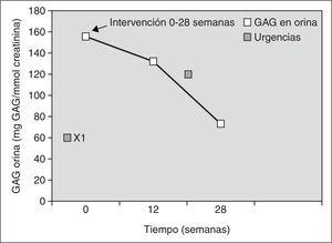 Figura 2. Monitorización de glucosaminoglucanos (GAG) en orina y su correlación clínica durante el tratamiento enzimático sustitutivo con α-L-iduronidasa durante 28 semanas en el caso 2. Previamente a la intervención no requirió ningún ingreso. Desde el inicio del tratamiento hasta el final se produjo una notable disminución paulatina de los GAG urinarios. Clínicamente permaneció estable sin adquisición de factores regresivos.