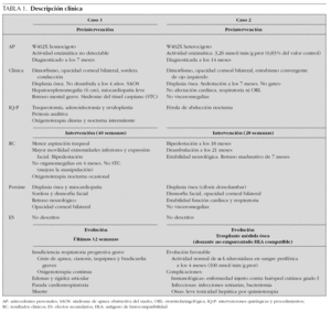 En el caso 2, tras 28 semanas de tratamiento enzimático sustitutivo, se observó una estabilización del desarrollo neurológico con un retraso madurativo de aproximadamente 7 meses. La bipedestación se produjo a los 18 meses y la deambulación a los 21. No se constataron modificaciones significativas en la displasia ósea (cifosis dorsolumbar marcada), la dismorfia facial ni en las opacidades corneales bilaterales y continuaron estables las funciones cardíaca y respiratoria, precisando ingresos hospitalarios únicamente por procesos intercurrentes. No se encontraron organomegalias. Analíticamente se cuantificó periódicamente la eliminación urinaria de los GAG con un descenso marcado (52,68 %) de los mismos en la semana 28 de intervención. Posteriormente, al disponer de un donante compatible, se realizó un trasplante alogénico de médula ósea (TMO) de donante no emparentado (Hospital Vall d'Hebron, Barcelona). Las concentraciones y la actividad de α -L-iduronidasa en sangre periférica fueron normales 4 meses después del trasplante. Como complicaciones presentó una enfermedad de injerto contra huésped cutánea grado I que se resolvió con corticoterapia, y procesos infecciosos intercurrentes que se resolvieron con antibioterapia intravenosa (tabla 1) (fig. 2).