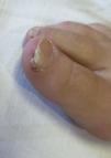 Niño de 9 años de edad con antecedentes personales de diabetes mellitus tipo 1 en tratamiento insulínico que consultó por una lesión subungueal en primer dedo del pie derecho de un mes y medio de evolución, dolorosa con la deambulación y a la palpación. No refirió historia de traumatismo local, uso de calzado estrecho, ni episodios de sangrado o supuración. El examen físico mostró un nódulo duro de coloración parduzca que emergía del surco lateral interno de la uña del primer dedo del pie derecho dando lugar a una deformidad ungueal, acompañado de hiperqueratosis, onicólisis y un collarete epidérmico rodeando la lesión (fig. 1). Se solicitó radiografía simple del pie derecho que mostró una formación exofítica de densidad ósea en el borde lateral interno de la falange distal (fig. 2). El paciente fue diagnosticado de exostosis subungueal y se planificó su extirpación quirúrgica.