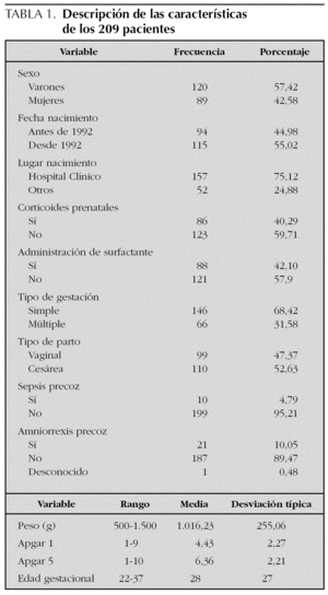 Se definieron las siguientes variables como características de nuestros pacientes: "sexo", "tipo de gestación" (simple o múltiple); "administración de corticoides prenatales" (presente o ausente); "amniorrexis" (< 24 h, ≥ 24 h); "semanas de gestación", "tipo de parto" (vaginal o por cesárea); "fecha de parto" distinguiendo a los nacidos antes de 1992 o a partir de ese año; "procedencia" (en el hospital mencionado o fuera del mismo); "peso al nacimiento", "puntuación de Apgar al primer y quinto minuto de vida"; "enfermedad de membrana hialina" clasificada en grados según los hallazgos clínicos y radiológicos previos a la ventilación asistida; "administración de sustancia tensoactiva" (no administrada, profiláctica o terapéutica) y la existencia o no de "sepsis precoz" con confirmación bacteriológica.