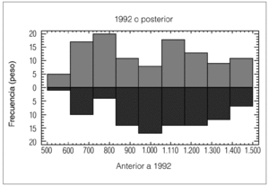Figura 1. Histogramas para peso según fecha (parte superior del eje $ 1992 y parte inferior , 1992).