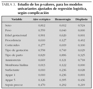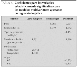 En la tabla 3 se describe el p-valor para los modelos univariantes ajustados de regresión logística. Teniendo en cuenta que en cada complicación las diferentes variables se interrelacionan, se considera sólo de interés el modelo multivariante final ajustado. En la tabla 4 aparecen los coeficientes de dichos modelos, sólo para las variables estadísticamente significativas en cada complicación. Los signos negativos indican disminución de la probabilidad de ocurrencia en la complicación correspondiente, recíprocamente los signos positivos indican aumento. Así por ejemplo, el signo negativo del peso hace que un mayor peso implique una disminución en la probabilidad de aparición de hemorragia pulmonar.