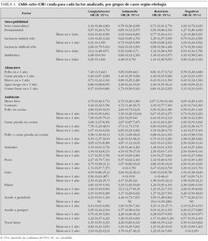 A partir de esta información se calcularon las odds ratio (OR) y los intervalos de confianza del 95 % (IC 95 %) para cada factor, usando los programas Epi Info V6.04 y, cuando hubo pocos casos, LogXact (CYTEL Software corporation). Se calcularon las OR para el conjunto de los niños y también diferenciando los grupos de menores y mayores de un año. Cuando el número de casos fue suficiente se utilizó el análisis mediante regresión logística múltiple incorporando las variables con valor p < 0,2 en el análisis simple con el programa SPSS v 10.0 y LogXact si fue necesario. Los resultados se analizaron tomando como casos los resultados positivos del coprocultivo, con 3 grupos de casos de interés: Campylobacter, Salmonella y rotavirus. Si algún coprocultivo tuvo un resultado mixto (10 casos), se dio prioridad a las bacterias. Como controles se usó siempre el mismo grupo de niños sin diarrea. El grupo de casos con coprocultivo negativo fue usado a modo de referencia o "control externo" de posibles sesgos relacionados con el hecho de padecer diarrea. Los análisis microbiológicos se realizaron todos en el mismo laboratorio, siguiendo técnicas habituales descritas en otro trabajo anterior8.