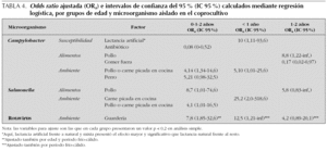 Del análisis de regresión múltiple se presentan los modelos con las variables de mayor efecto y que con significación estadística (p < 0,10) en cada grupo (tabla 4). Se observaron resultados que semejantes a los del análisis simple, con alguna pequeña variación (p. ej., la presencia de perros parecía más importante como factor de riesgo de Campylobacter). Otras variables perdieron significación estadística o no pudieron ser incorporadas al modelo por no disponer de suficientes casos. Con lo cual, los factores presentados en este modelo son los que mayor fuerza de asociación tuvieron en nuestra población. También, a pesar de disponer de datos sobre si los animales domésticos padecían diarrea, el grado de cocción de los alimentos, o la profesión de los padres, el número de respuestas afirmativas fue muy bajo para analizar este aspecto. Por ejemplo, sólo en 4 niños, uno de cada grupo, la ocupación de los padres fue considerara como riesgo de zoonosis (carnicería, ganadería).