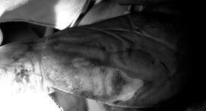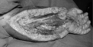 Al segundo día de ingreso presenta aumento de las lesiones, con edema duro en brazo izquierdo y pierna derecha. Durante este tiempo se mantuvo estable hemodinámicamente. Se realiza un test rápido faríngeo a estreptococo positivo y se añade clindamicina (40 mg/kg) ante sospecha de enfermedad invasiva por estreptococo del grupo A. Al tercer día aparecen vesículas sobre la tumefacción del antebrazo, dolor a la extensión de los dedos y aumento del edema en región posterior de la pierna (fig. 1). Se decide realizar fasciotomía de miembro superior izquierdo (necrosis subcutánea y musculatura pálida) (fig. 2) e ingresar en UCIP. Se añadió penicilina por crecimiento de Streptococcus pyogenes en las lesiones y frotis faríngeo; el resto de cultivos (sangre, orina, LCR) fueron estériles. Ante la progresión de las lesiones en las otras extremidades se realizan fasciotomías el cuarto y quinto días, y se inicia ventilación mecánica y soporte inotrópico. Al séptimo día se administra gammaglobulina inespecífica intravenosa (2 g/kg/dosis única). Evoluciona de forma favorable, con estabilidad hemodinámica, suspensión del soporte inotrópico, descenso de leucocitosis y reactantes de fase aguda. En las revisiones quirúrgicas realizadas diariamente se observa mejoría de las lesiones y negativización de cultivos. El tratamiento antibiótico se mantuvo durante 14 días.