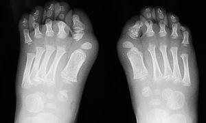Caso 1. Varón sin antecedentes de interés que en julio de 2003, a los 30 meses de edad, ingresó por una tumoración pequeña, mal definida y dolorosa en región cervical derecha, que coincidiendo con la varicela se extendió hacia la escápula. Estaba afebril y tanto la analítica como el cariotipo fueron normales. Se evidenció hallux valgus (fig. 1), clinodactilia y una calcificación de 2 x 1 cm en la eminencia tenar de la mano derecha (fig. 2). La ecografía y la resonancia magnética revelaron engrosamiento de la fascia. La biopsia resultó compatible con fascitis nodular versus seudotumor inflamatorio. Por la sospecha de FOP, en agosto inició tratamiento con alendronato 20 mg/semana de forma continuada y con corticoides e ibuprofeno en los empeoramientos clínicos. En junio de 2004 la enfermedad había progresado y se evidenciaban masas de consistencia dura a lo largo de la espalda, en regiones paravertebrales y bajo la axila derecha, con importante limitación para la movilidad del brazo, que apenas podía separar del tronco y de la columna cervical, que sólo conservaba el movimiento de flexión.