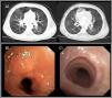 A) Tomografía computarizada (TC) pulmonar. Patrón en mosaico bilateral compatible con bronquiolitis obliterante; B) Broncoscopia flexible. Estenosis traqueal del 60-70% de la luz traqueal por granulomas; C) Broncoscopia flexible. Membrana residual tras corticoterapia y dilataciones, 3 meses después de la imagen B).