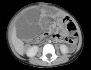 Al persistir la fiebre alta y la afectación del estado general se inicia tratamiento empírico con ceftriaxona intravenosa a las 48 h del ingreso. Al quinto día de ingreso, ante el empeoramiento del estado general junto con aumento de la distensión abdominal, se realiza ecografía abdominal urgente que muestra estructura quística septada de gran tamaño en hemiabdomen derecho (fig. 1) y tomografía computarizada (TC) abdominal donde se observa una gran masa abdominal de densidad líquido que desplaza el resto de estructuras abdominales (fig. 2). La analítica en este momento muestra una proteína C reactiva de 32,5 mg/dl con un hemograma y fórmula similar a la analítica del ingreso.