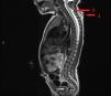 Al día siguiente se objetiva engrosamiento de la lesión con contenido serohemático que aumenta de tamaño con el aumento de la presión intraabdominal (fig. 2). Se realiza una ecografía cervical, que muestra un trayecto hipoecogénico que alcanza un área de pequeña ausencia de fusión de láminas posteriores. Se realiza una resonancia magnética, en la cual se visualiza un trayecto ascendente que alcanza el saco tecal, ligeramente dilatado a nivel de C4-C5, con médula levemente traccionada hacia el mismo con inclusión de las cubiertas meníngeas (fig. 3). A los 4 días de vida se realiza disección y cierre del defecto. La anatomía patológica describe tejido glioneuronal en dermis media-profunda con positividad para S100 y proteína glial fibrilar (GFAP), además de un tracto fibroso incompleto con celularidad positiva para GFAP.