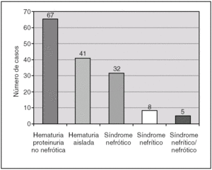 Con referencia a la forma de presentación de la nefropatía, encontramos como más frecuente la hematuria/ proteinuria no nefrótica seguida de la hematuria aislada a diferencia de otras series en que el hallazgo más frecuente fue la hematuria aislada. Generalmente la determinación mediante tira reactiva en orina de la presencia de hematuria/proteinuria es un buen elemento de cribado para la detección de la presencia de afectación renal, aunque cabe hacer hincapié en que la presencia de tira reactiva negativa en el inicio no descarta la presencia de nefropatía en un futuro.