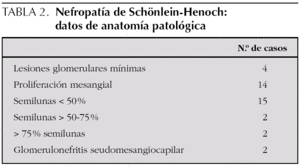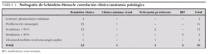 Con referencia a la correlación clínico/anatomopatológica los datos se muestran en la tabla 3 destacando la presencia de semilunas mayores de 50 % como el dato anatomopatológico más fiable por lo que respecta a la evolución a insuficiencia renal.