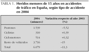 Entre las medidas preventivas, las acciones legislativas han demostrado ser las más efectivas, poniendo límites de edad para la utilización de las motos y obligando al uso del casco 3. De todos modos, las restricciones legales son poco operativas sin el correspondiente control de su cumplimiento, que todavía es más difícil en áreas rurales, con población diseminada, carreteras secundarias y vías sin asfaltar. De hecho, el Anuario Estadístico de la Dirección General de Tráfico de 2004 7 refleja que los accidentes de tráfico en menores de 15 años, si bien han disminuido globalmente en un 11,3 % respecto al año 2003, aquéllos en los que los menores viajaban en vehículos de dos ruedas (bicicletas y ciclomotores) han aumentado ligeramente (tabla 1). Este dato es especialmente preocupante si tenemos en cuenta que el reglamento de tráfico aprobado en el año 2002 y que entró en vigor a lo largo de 2003 fue redactado con un interés especial para prevenir los accidentes en los que se veían implicados los vehículos de dos ruedas.