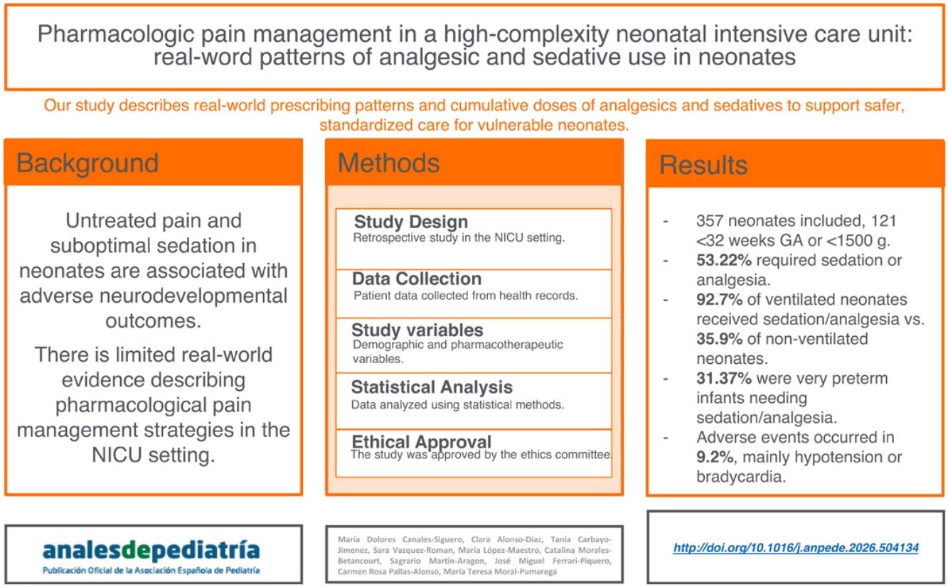 El manejo eficaz del dolor en neonatos sigue siendo un desafío importante, con datos limitados sobre las estrategias farmacológicas utilizadas en unidades de cuidados intensivos neonatales (UCIN) en la práctica clínica real. La exposición neonatal al dolor no tratado y a una sedación subóptima se ha asociado con efectos adversos en el neurodesarrollo. El objetivo de este estudio fue describir los patrones reales de uso de fármacos sedantes y analgésicos en una UCIN de alta complejidad.