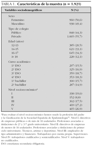 Se obtuvo una muestra definitiva de 1.921 escolares: 1.334 alumnos de ESO y 587 de bachiller. En la tabla 1 se pueden observar las características de la muestra. La proporción de varones:mujeres fue de 1:1 (938 varones y 960 mujeres). El 55,7 % de las encuestas correspondían a estudiantes de colegios privados-concertados. La mayoría de los estudiantes pertenecían a familias trabajadoras de nivel socioeconómico IV (27,2 %) y V (26,9 %).