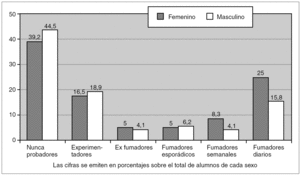 En la figura 2 se pueden observar las diferencias de consumo entre varones (26,1 % fumadores habituales) y mujeres (38,3 % fumadoras habituales). Las chicas adolescentes comenzaban a fumar algo más tarde (13,3 ± 1,6) que los chicos adolescentes (12,9 ± 2,1) pero superaban a éstos en todos los demás parámetros. Las estudiantes consumían de media 7,1 ± 4,9 cigarrillos al día frente a los 6,4 ± 4,7 cigarrillos de consumo medio de los chicos.
