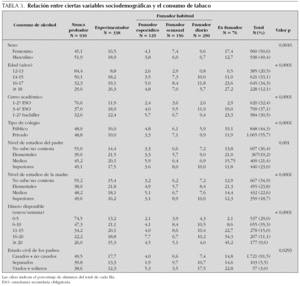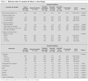 El consumo de tabaco y alcohol seguía una asociación muy estrecha (tabla 2), de tal forma que más del 90 % de aquellos que habían experimentado con el tabaco en algún momento de su vida, también habían probado el alcohol, frente a sólo un 53,3 % de probadores de alcohol entre los adolescentes que nunca habían probado el tabaco. A medida que el adolescente avanzaba en el consumo de tabaco se observaba que la prevalencia, la frecuencia de consumo de alcohol y el número de intoxicaciones etílicas eran mayores, así el 99,7 % de los fumadores diarios, habían probado el alcohol, el 47,9 % de ellos consumía alcohol una o más veces por semana y el 82,8 % había sufrido al menos un episodio de intoxicación etílica.