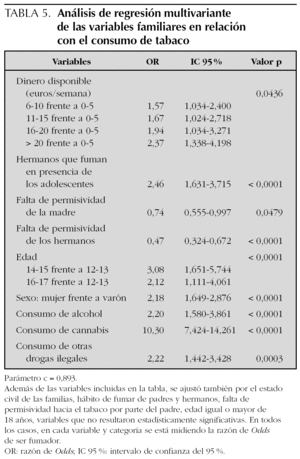 En la tabla 5 se enumeran los resultados del análisis de regresión logística múltiple. Aunque en el análisis univariante parece que el hábito de fumar de los padres y hermanos se correlaciona con la prevalencia de tabaco de los adolescentes, esta asociación dejó de ser significativa en el análisis de regresión múltiple.