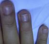 Niño de 6 años que presenta pulpitis del cuarto dedo de la mano izquierda de 15 días de evolución, con descamación y fisuración, sin signos de sobreinfección (fig. 1), sin mejoría tras 10 días de antibioterapia tópica y piqueteado ungueal en varios dedos de ambas manos (fig. 2). Afebril, sin otras lesiones cutáneas. Se pensó en una infección fúngica o un panadizo. El cultivo de la lesión fue negativo. Fijándonos en el resto de las uñas el piqueteado ungueal nos condujo al diagnóstico de psoriasis ungueal. No presentaba antecedentes familiares de psorasis ungueal o cutánea.