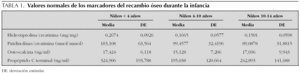 Para el estudio del recambio mineral óseo se han analizado los siguientes marcadores biológicos: de reabsorción ósea, la hidroxiprolina y las piridinolinas urinarias, mediante cromatografía líquida de alta resolución (HPLC) con detector UV/VIS, de Bio-Rad e inmunoanálisis enzimático Pyrilinks® (Metra), respectivamente; de aposición ósea, la osteocalcina y el propéptido C terminal en sangre, mediante inmunoanálisis enzimáticos NovoCalcint® (Metra) y Procolagen-C® (Metra), respectivamente. Como grupo control para el estudio del recambio mineral óseo se ha utilizado una población de 75 niños normales de entre 6 meses y 14 años en la que se determinaron los valores de los marcadores bioquímicos del recambio óseo 4 (tabla 1).