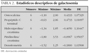 En el grupo de niños con galactosemia no se han detectado alteraciones significativas del recambio mineral óseo ni de la densitometría, en contraposición con los hallazgos de otros autores 14,15, que han descrito una disminución de la mineralización ósea en estos pacientes y que puede ser debida a la deficiencia estrogénica en las mujeres afectadas, a un defecto de glucosilación de las proteínas de la matriz ósea y a la presencia de una dieta deficiente en calcio. Nuestro grupo de niños con galactosemia es pequeño y es posible que ello condicione los resultados obtenidos, pero también parece razonable pensar que gracias a los cuidados dietéticos a los que hoy en día se somete a estos pacientes, y al ejercicio físico reglado es posible prevenir la presencia de alteraciones significativas de la mineralización ósea.