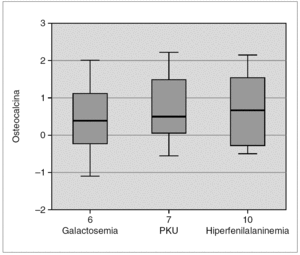 Los marcadores biológicos del recambio mineral óseo tienen un comportamiento diferente en función del grupo de enfermedad considerada. Si se consideran los relacionados con la aposición mineral ósea; los pacientes con galactosemia tienen un estándar score medio de 0,4333 para la osteocalcina y de 0,4733 para el propéptido C terminal. En los pacientes PKU los resultados son de 0,7529 para la osteocalcina y de 0,2314 para el propéptido C terminal. En los pacientes con hiperfenilalaninemia media los valores son de 0,6740 para la osteocalcina y 0,9090 para el propéptido C terminal.