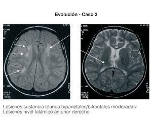 Entre los 2 pacientes trasplantados (fig. 2), el diagnóstico también se realizó en el primer mes de vida, y se inició tratamiento con fototerapia y fenobarbital. En uno de ellos el trasplante fue realizado a los 2 años y 5 meses, tras evidenciarse BI persistentemente elevada por encima de 25 mg/dl con rechazo de la fototerapia por parte de los padres y signos de deterioro neurológico progresivo con hipotonía axial, incapacidad para la sedestación y deambulación, pérdida del lenguaje y crisis convulsivas. En el electroencefalograma (EEG) se apreció actividad cerebral retardada generalizada con lesiones visibles en resonancia magnética (RM) en la sustancia blanca bifrontal, biparietal, así como en el tálamo y y el caudado (fig. 3). Del mismo modo, se detectó un retardo importante en la respuesta a los estímulos de las vías auditivas y visuales. A pesar del buen control de la BI tras el trasplante, la paciente continuó con un retraso psicomotor grave y falleció a los 9 meses de la intervención debido a un síndrome de Budd-Chiari en el injerto. El otro se trasplantó a los 3 años y 4 meses de edad ante el mal control de las cifras de BI con fototerapia. Con posterioridad al trasplante se normalizó el metabolismo de la bilirrubina y tuvo una evolución favorable.