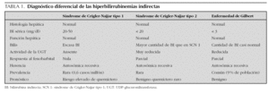 Si el déficit de la enzima es total (SCN tipo 1) la concentración de bilirrubina indirecta (BI) supera con frecuencia los 20 mg/dl, no existen restos de bilirrubina conjugada en el aspirado duodenal y no hay respuesta al tratamiento con enzimas inductoras de la UGT como el fenobarbital 8,9. En estos pacientes el riesgo de querníctero es importante, lo que ensombrece su pronóstico si no se instaura un tratamiento 6,10. Esta complicación neurológica constituye el principal riesgo en el tratamiento de estos niños, de modo que se produce una necrosis celular en los ganglios de la base, el hipocampo, el núcleo cerebeloso y la sustancia gris 6,10,11, producida por el depósito de BI que, cruzando a altas dosis la barrera hematoencefálica, inhibe la síntesis de ARN y proteínas, y altera el metabolismo de los hidratos de carbono y la respiración mitocondrial. Por el contrario, cuando el déficit de la enzima es parcial (SCN tipo 2) la BI rara vez supera los 20 mg/dl, existe respuesta al fenobarbital y el curso es más benigno y con pocas probabilidades de desarrollar querníctero 12 (tabla 1).