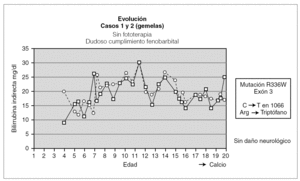 En las 2 pacientes gemelas homozigotas el seguimiento ha sido hasta los 20 años de edad. Fueron diagnosticadas al final del primer mes de vida, y han sido tratadas desde entonces con fenobarbital con respuesta parcial al mismo. Durante el seguimiento han tenido fluctuaciones de la BI en función del cumplimiento del tratamiento y de la aparición de procesos intercurrentes (fig. 1). Una de las pacientes fue diagnosticada a los 13 años de una púrpura trombocitopénica idiopática resistente al tratamiento con corticoides y con gammaglobulinas, y que precisó para su curación la esplenectomía; otra paciente presenta litiasis biliar. Hasta el momento no se ha planteado en estas pacientes el trasplante hepático al tener un desarrollo psicomotor normal con cifras de BI mantenidas durante la mayor parte de su evolución por debajo de 25 mg/dl.