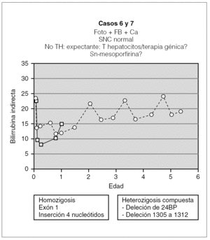 Los 2 pacientes restantes tienen ahora 2 y 6 años, y fueron diagnosticados a los 60 días y a la semana de vida, respectivamente. Ambos siguen tratamiento con fototerapia entre 9 y 16 h al día y con quelantes de sales biliares. Con ello mantienen la BI < 25 mg/dl (fig. 5) con desarrollo neurológico dentro de la normalidad. A pesar de la buena evolución en ambos casos, conviene mantener una actitud expectante en el futuro, ya que con la edad la fototerapia parece ser menos efectiva y estos pacientes son los más jóvenes de la serie.