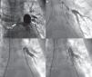 A) Angiografía del árbol pulmonar en la que se observa la tortuosidad de la rama pulmonar derecha (RPD), la gran dilatación de la rama pulmonar izquierda (RPI) y las estenosis filiformes (flechas) de 2 arterias segmentarias del pulmón izquierdo. B) Estenosis filiforme de una arteria segmentaria del lóbulo inferior izquierdo. C) La misma arteria segmentaria tras el implante de un stent. D) Angiografía tras el implante de 3 stents en la arteria lobar inferior izquierda y 2 arterias segmentarias.