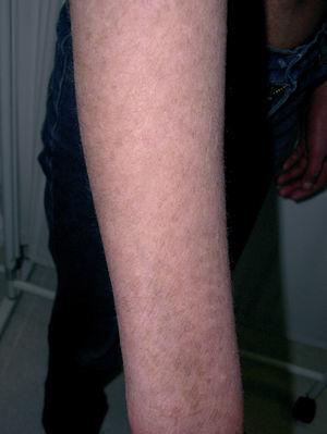 Figura 1. Hipopigmentaciones e hiperpigmentaciones residuales de aspecto poiquilodérmico en la cara dorsal del brazo derecho.