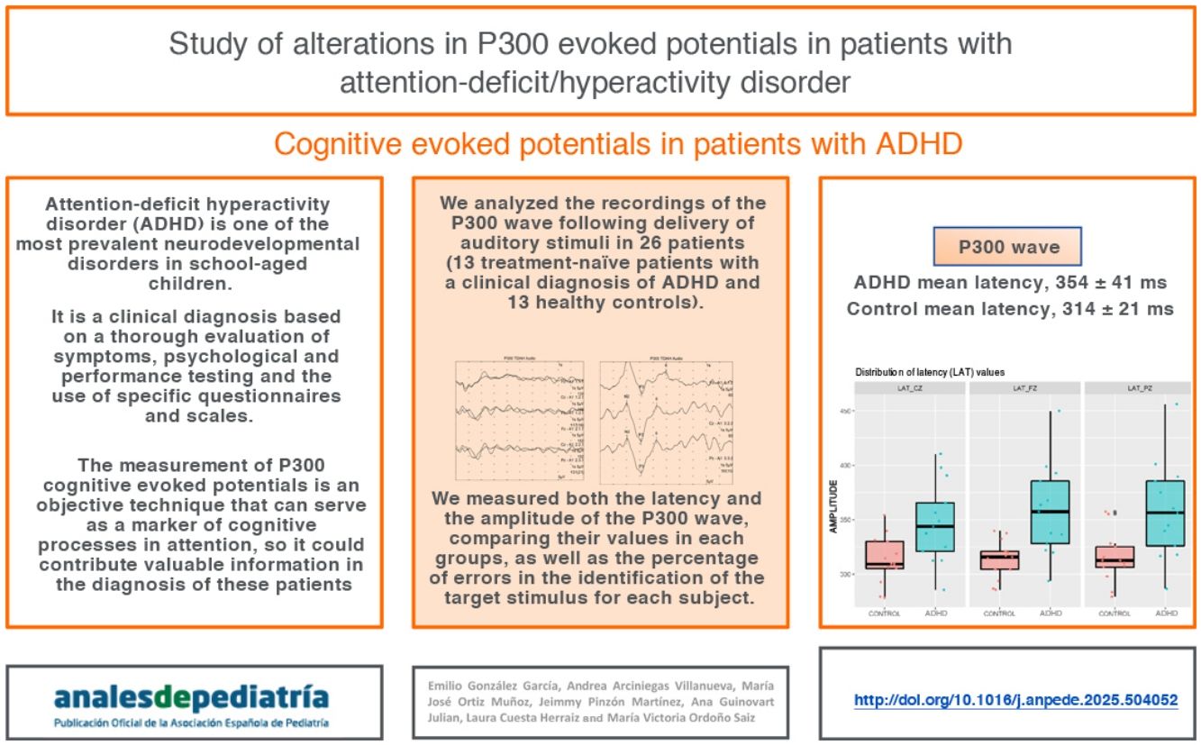 ConclusionPediatric patients with ADHD exhibited responses with a higher mean latency compared to peers without the disorder, so the assessment of P300 component cognitive evoked potentials could be used as an objective measure to support the diagnosis of ADHD.