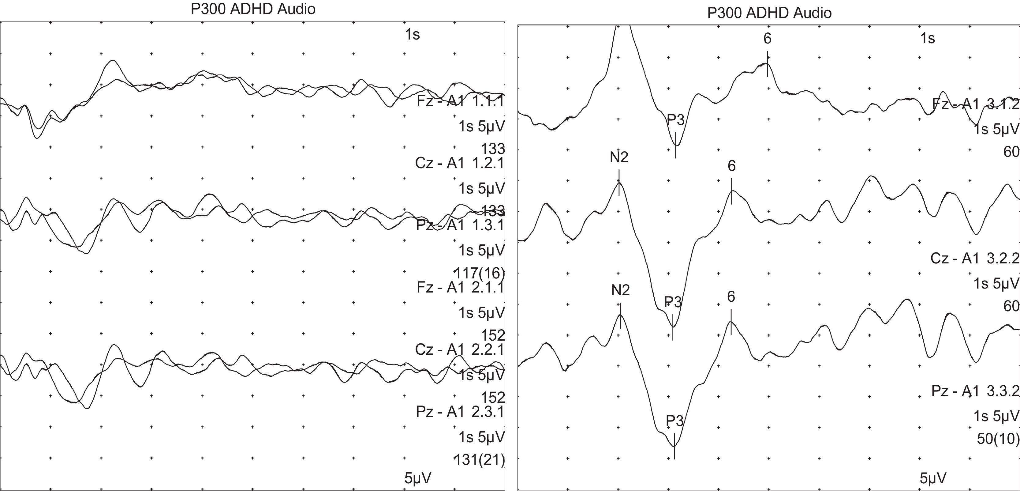 The use of auditory P300 combined with clinical tests can help make more reliable diagnoses and to guide pharmacotherapy in patients with objective confirmation of attention deficits.