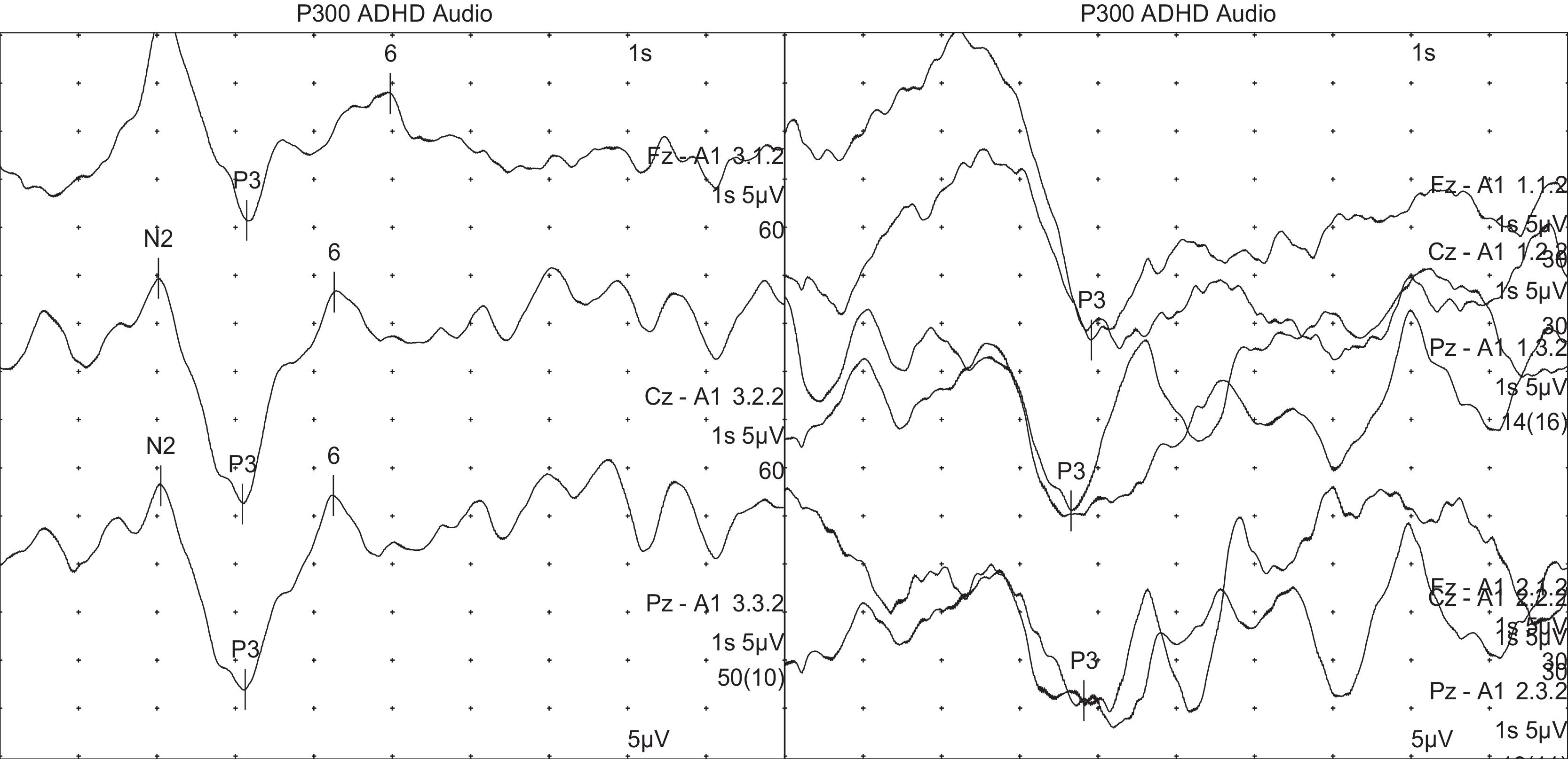 We recorded responses in all study subjects and calculated the mean (SD) values for the Fz, Cz, and Pz electrode set, finding a P300 latency of 354.25 (41) ms and an amplitude of 11.98 (5.6) μV in the ADHD group and a P300 latency of 313.59 (21) ms and an amplitude of 13.24 (5.9) μV in the control group.